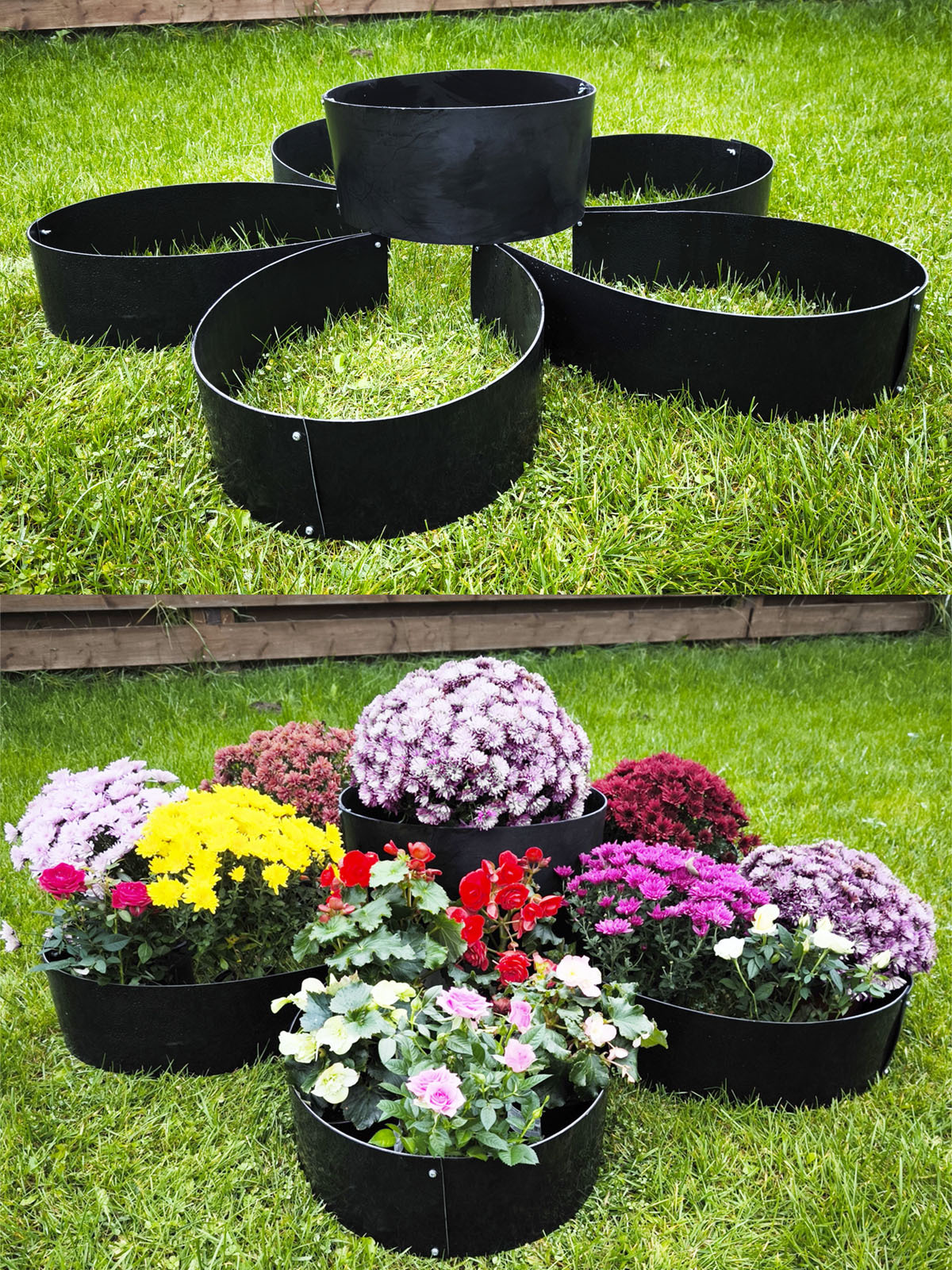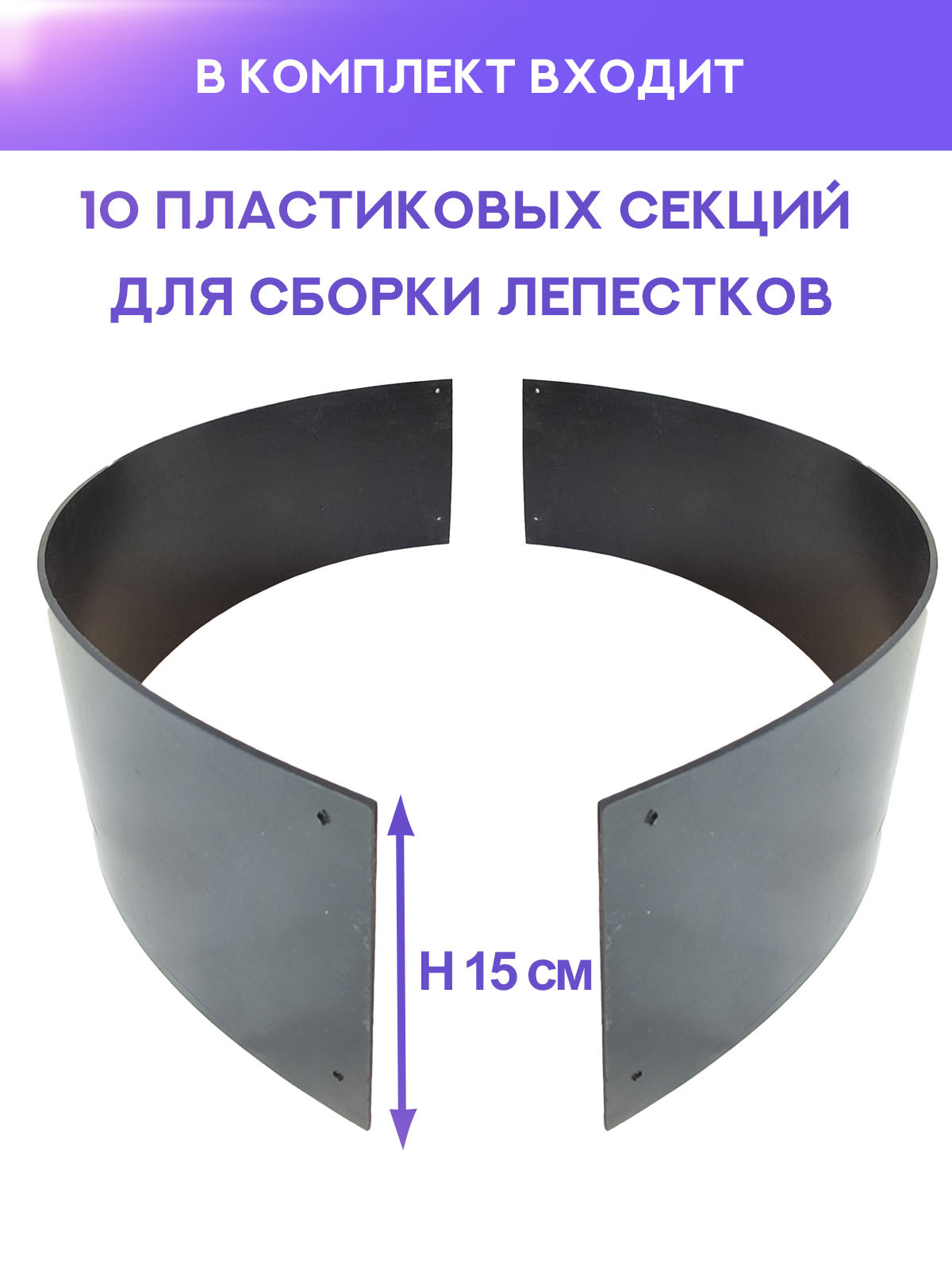 Клумба трансформер Собирается из отсеков пластика толщиной 3 мм при помощи креплений (входят в комплект) Материал сверхпрочный, морозостойкий. Не рубится триммером травокосилки. Благодаря этому клумба прослужит долгие годы. Можно переставлять на новое место в новом сезоне. Одна и та же клумба собирается несколькими способами. Можно включить фантазию и собрать разные конструкции используя несколько комплектов в ландшафтную композицию. Используйте дополнительно для декорирования кору, гравий. Клумба подходит для разных растений. Высота 10 см — для низких или почвопокровных растений, центральные высокие ярусы для разных садовых цветов. Ваш участок будет привлекательным и радовать новыми цветочными композициями. Соберите клумбу по инструкции. Соедините отсеки при помощи винтовых креплений. 10 секций для сборки лепестков и 2 секции для сбора сердцевины.
