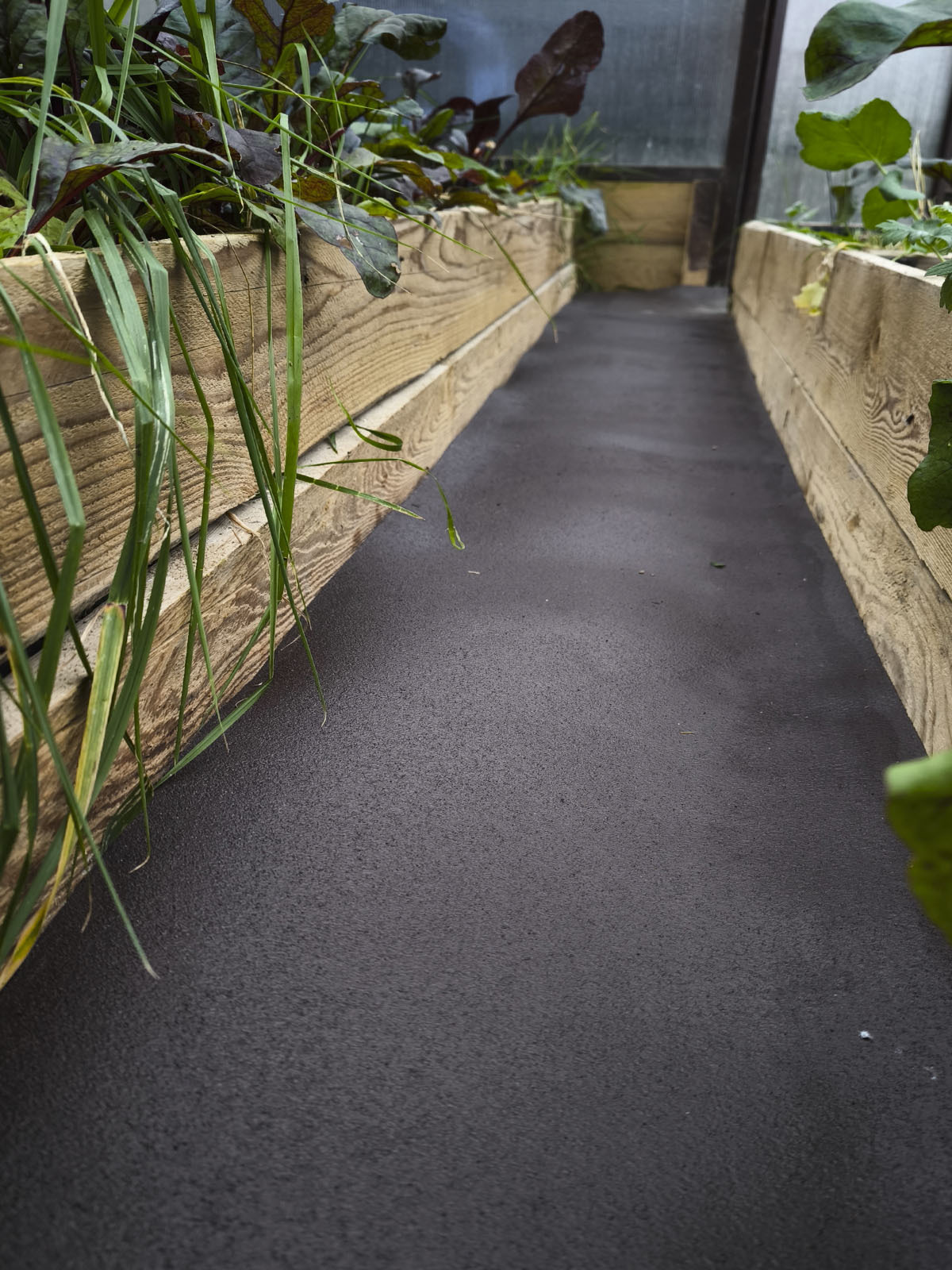 Рулонное покрытие из композита резины и пластика на армированной сетке служит для покрытия дорожек, тропинок, междурядий грядок на даче или садовом участке.